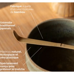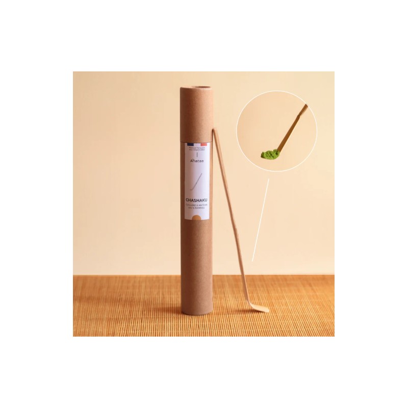 Taillé dans un seul morceau de bambou naturel, le Chashaku possède une courbe élégante spécifiquement étudiée pour prélever la fine poudre de matcha avec délicatesse et la déposer au fond de votre bol (Chawan).